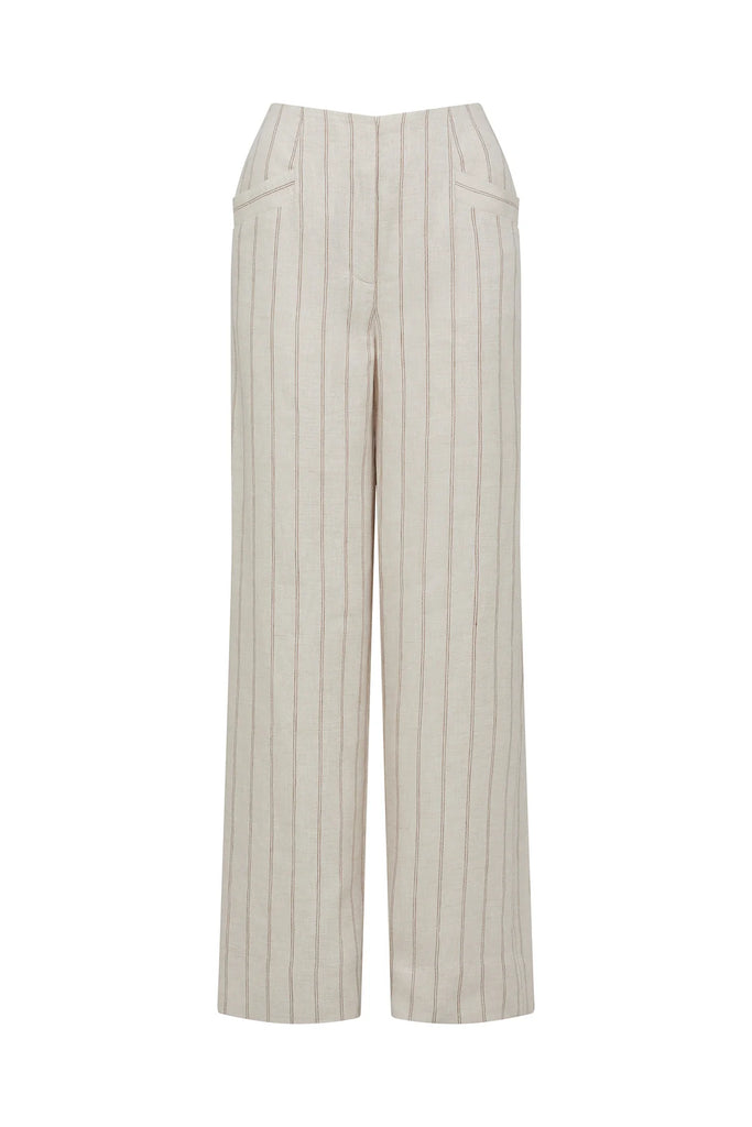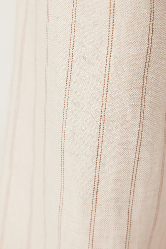 The Savannah Linen Pant is a regular fit style in pure linen twill with a pinstripe design. Featuring a flat front and wide leg silhouette, it includes a zip fly with hook and bar closure, front pockets and back welt pockets. A versatile tailored pant that brings ease to summer outfitting.