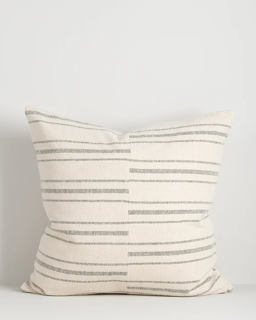 A study in balance, the Abbott cushion features asymmetric line work in sage, woven into a natural ecru base. Crafted from a soft cotton blend, the generous size offers both comfort and refined simplicity