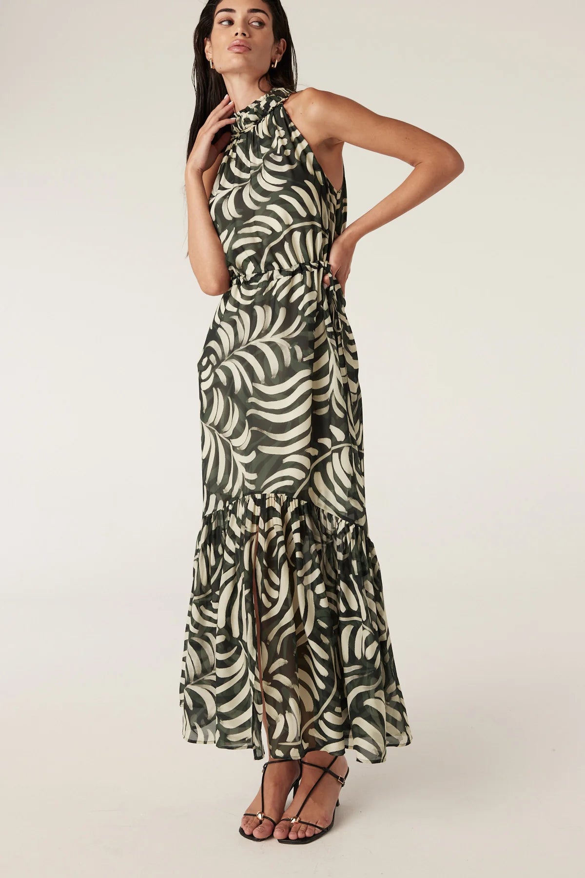 The Eden Halter Neck Dress is made from a lightweight silk blend chiffon in an exclusive print. It features a halter neck with a back button closure, a drawstring waist and a hem frill with a front split. Fully lined, this dress brings ease and fluidity to occasion dressing.
