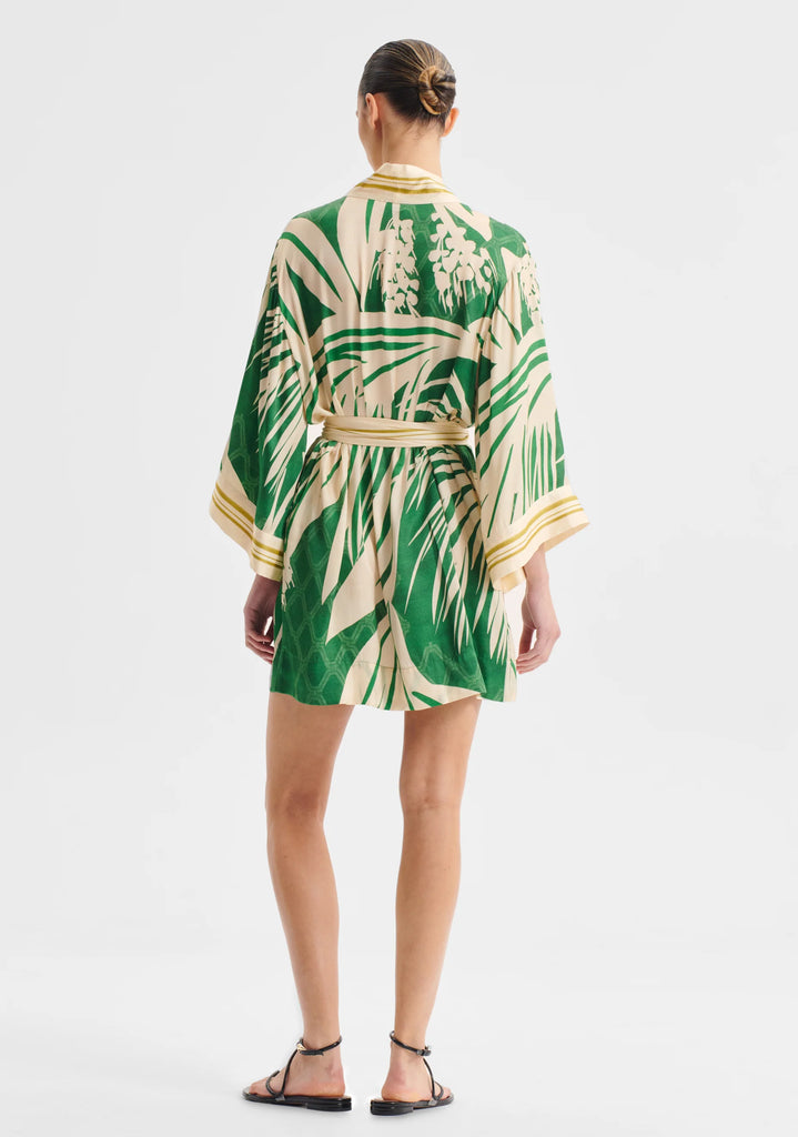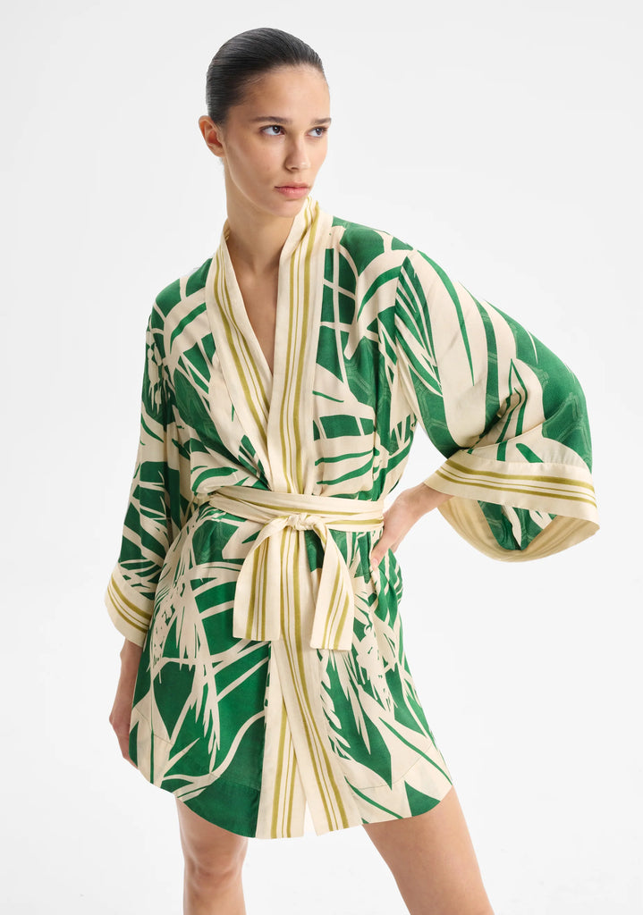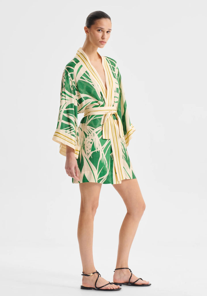 The Sorrento Robe in Lenzing™ Ecovero™ satin-finish fabrication showcases an exclusive Morrison print. A wrap silhouette with wide bracelet sleeves and side seam pockets offers both comfort and sophistication. The border trim at the front, cuffs, and tie adds refined contrast to this above-knee, relaxed fit style.