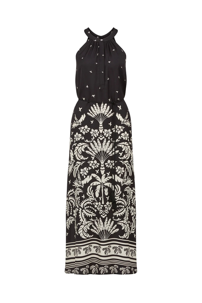The Temple Halter Neck Dress features an exclusive print with a border hem design and a relaxed fit. Made from a silk blend fabric, it includes a front half placket button closure and a matching fabric tie with tassels.