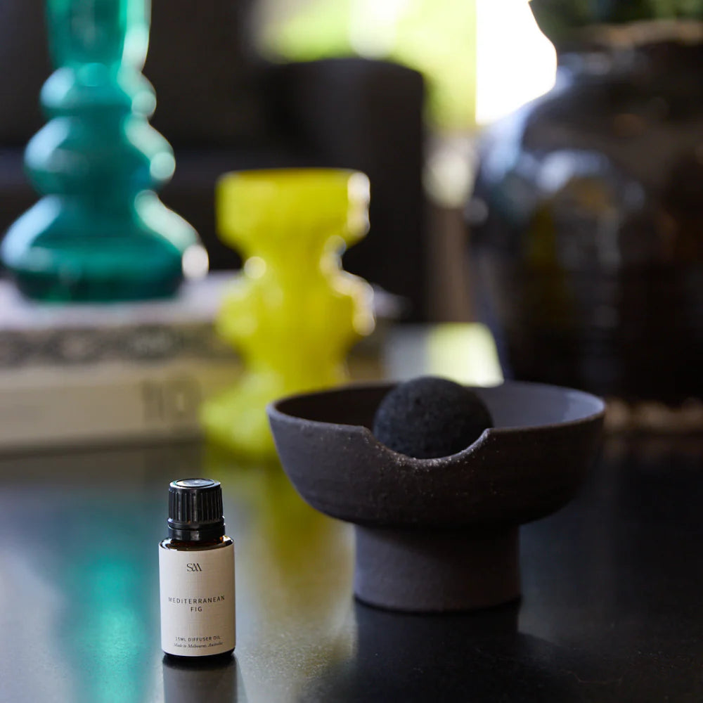Our Obsidian Scented Diffuser pairs the moody depth of volcanic rock with a sculptural ceramic tray, handcrafted from pure black clay in Melbourne. The fragrance opens with ripe Mediterranean fig, zesty Italian lemon, and grapefruit. At its heart, gardenia and creamy coconut soften the citrus before giving way to a warm, grounding base of woody amber and sun-dried hay. Uplifting, earthy, and effortlessly refined.