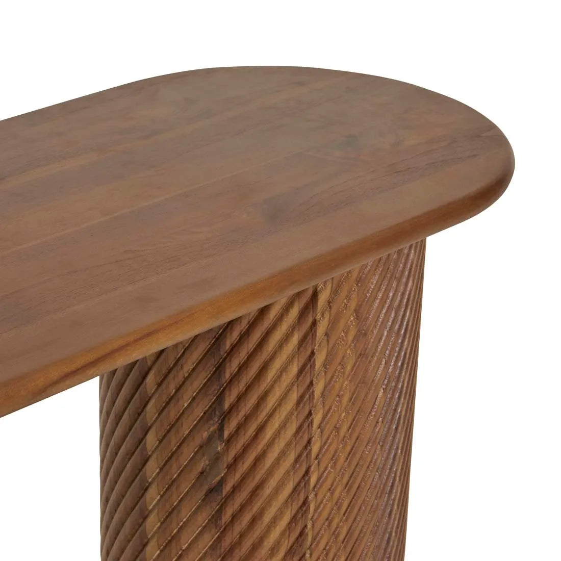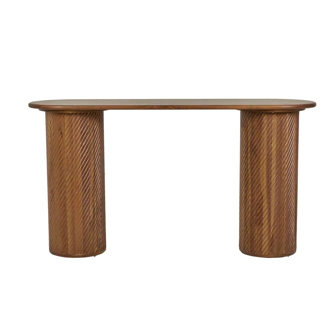 Textured pillar supports steal the show on the Orion Pillar Console. Composed of beautiful teak this gorgeous console is finished with a simple demi bullnose top.