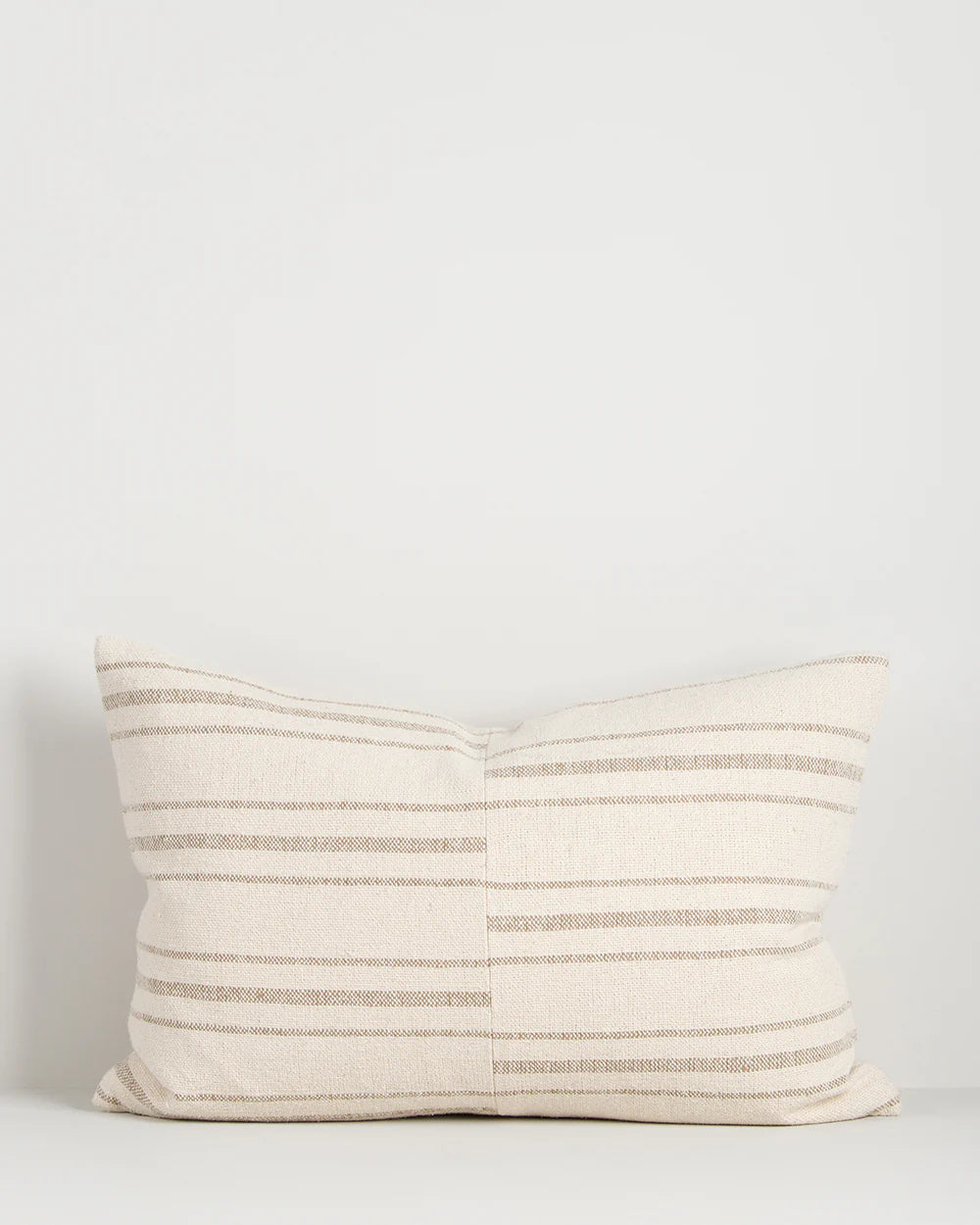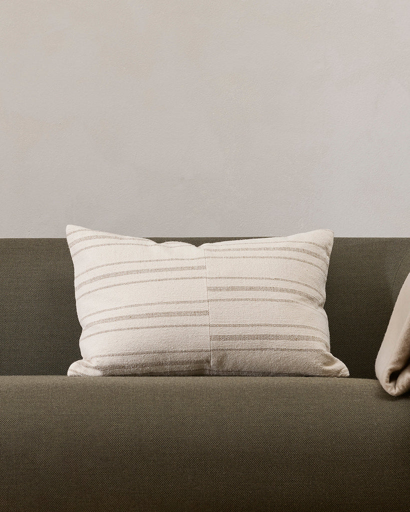 A study in balance, the Abbott cushion features asymmetric line work in a natural ecru palette for a look that feels subtle, modern and serene. Woven from a soft cotton blend, the lumbar shape adds the final layer of comfort for a fresh contemporary interiors.