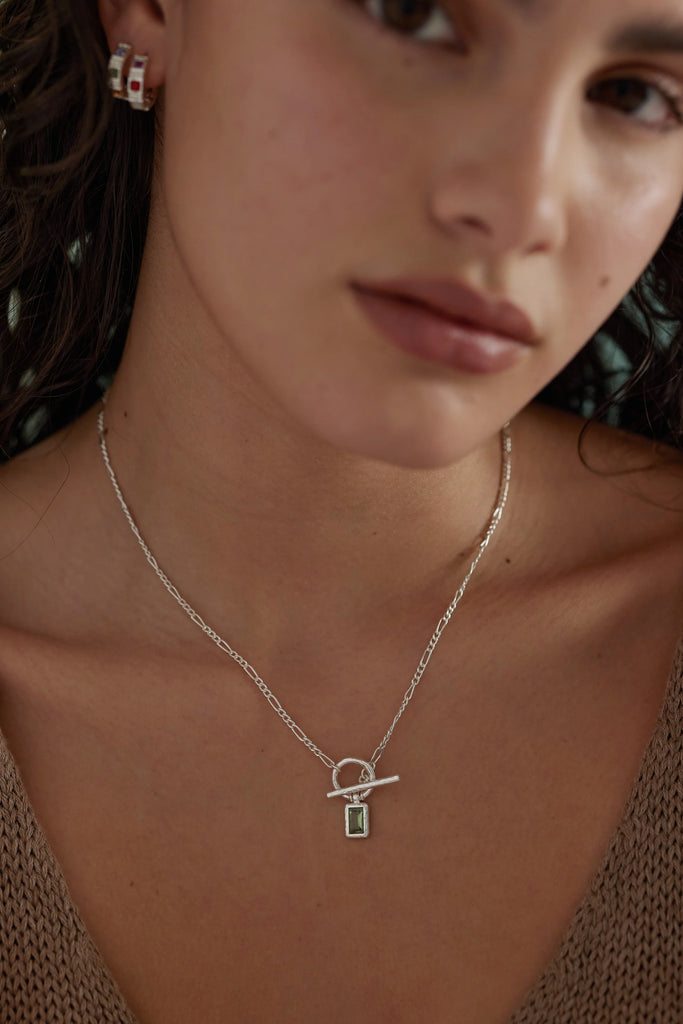 The Apatite Toggle Necklace brings all eyes forward - with a bold Figaro chain, front toggle clasp, and a baguette-cut Apatite suspended from the centre.