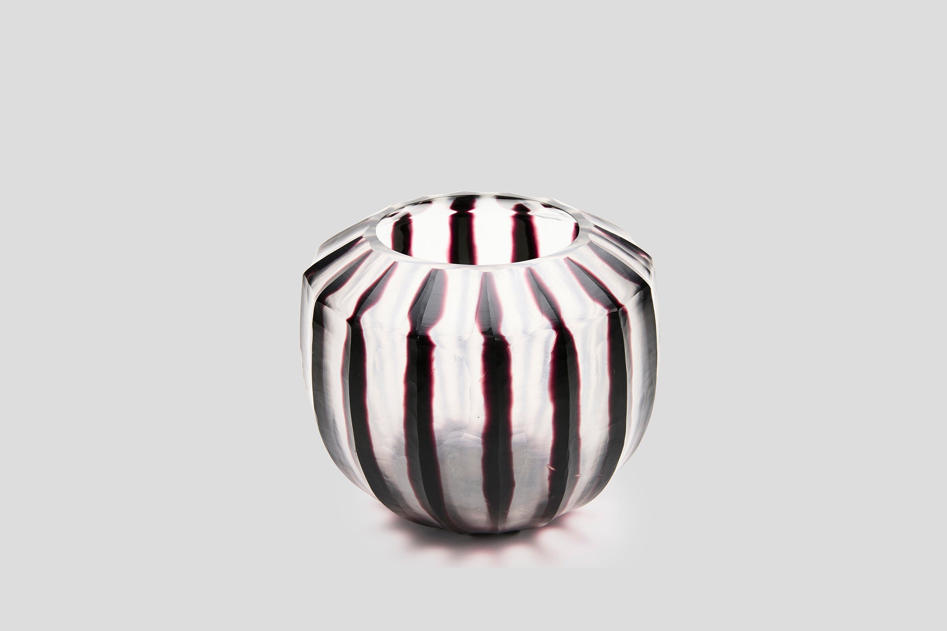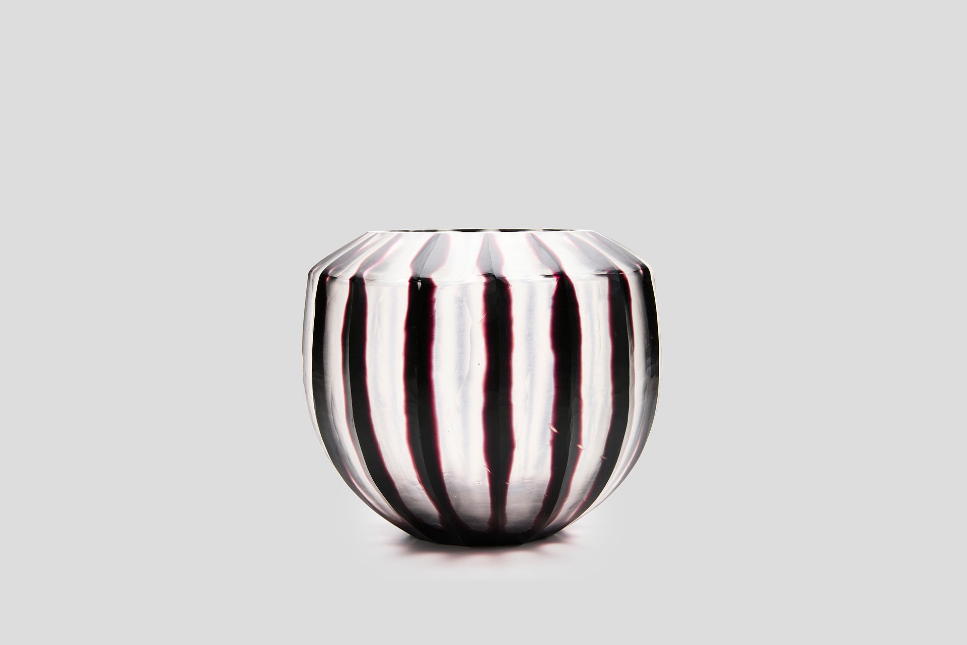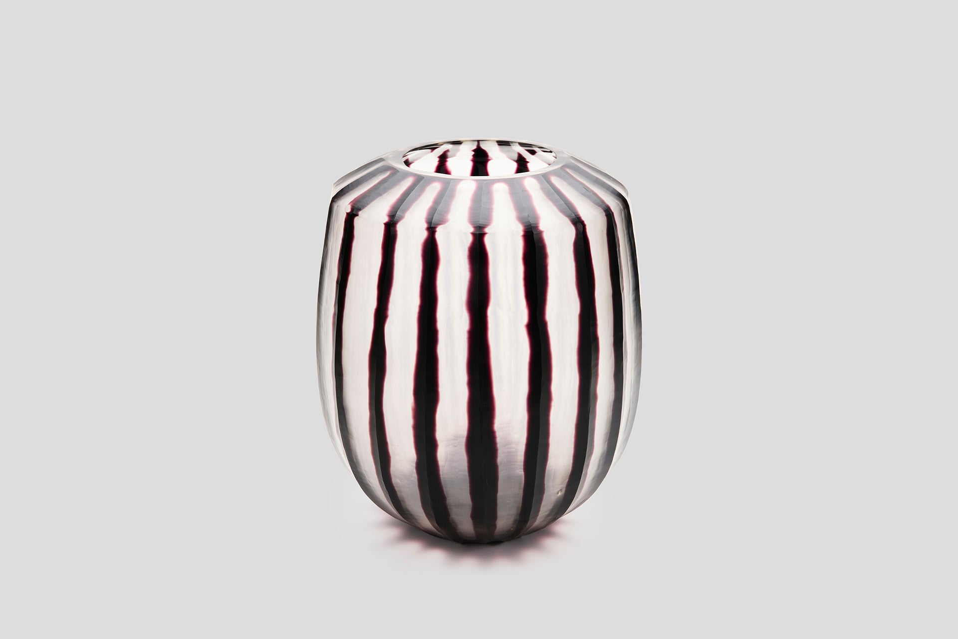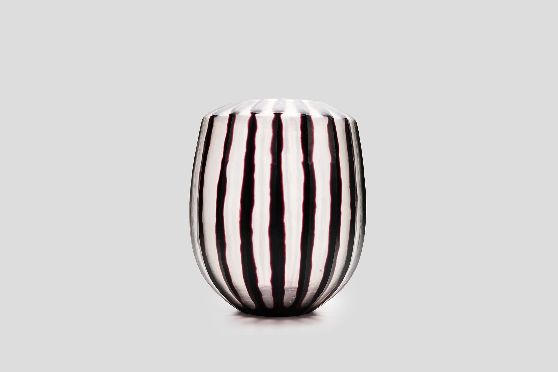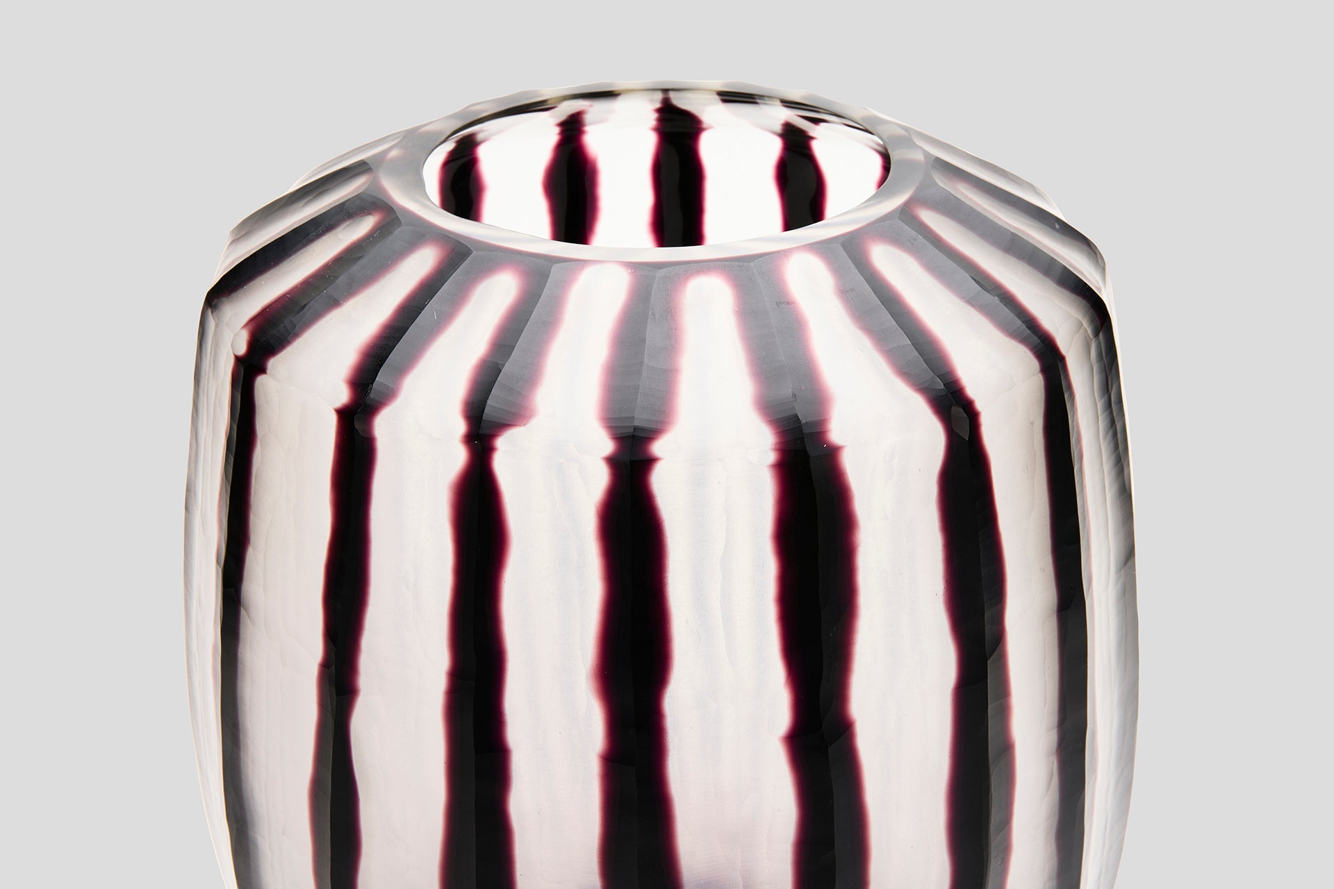 The Banda vases are mouth-blown and fused with rich mahogany and clear glass, creating a bold striped pattern that defines their striking silhouette.