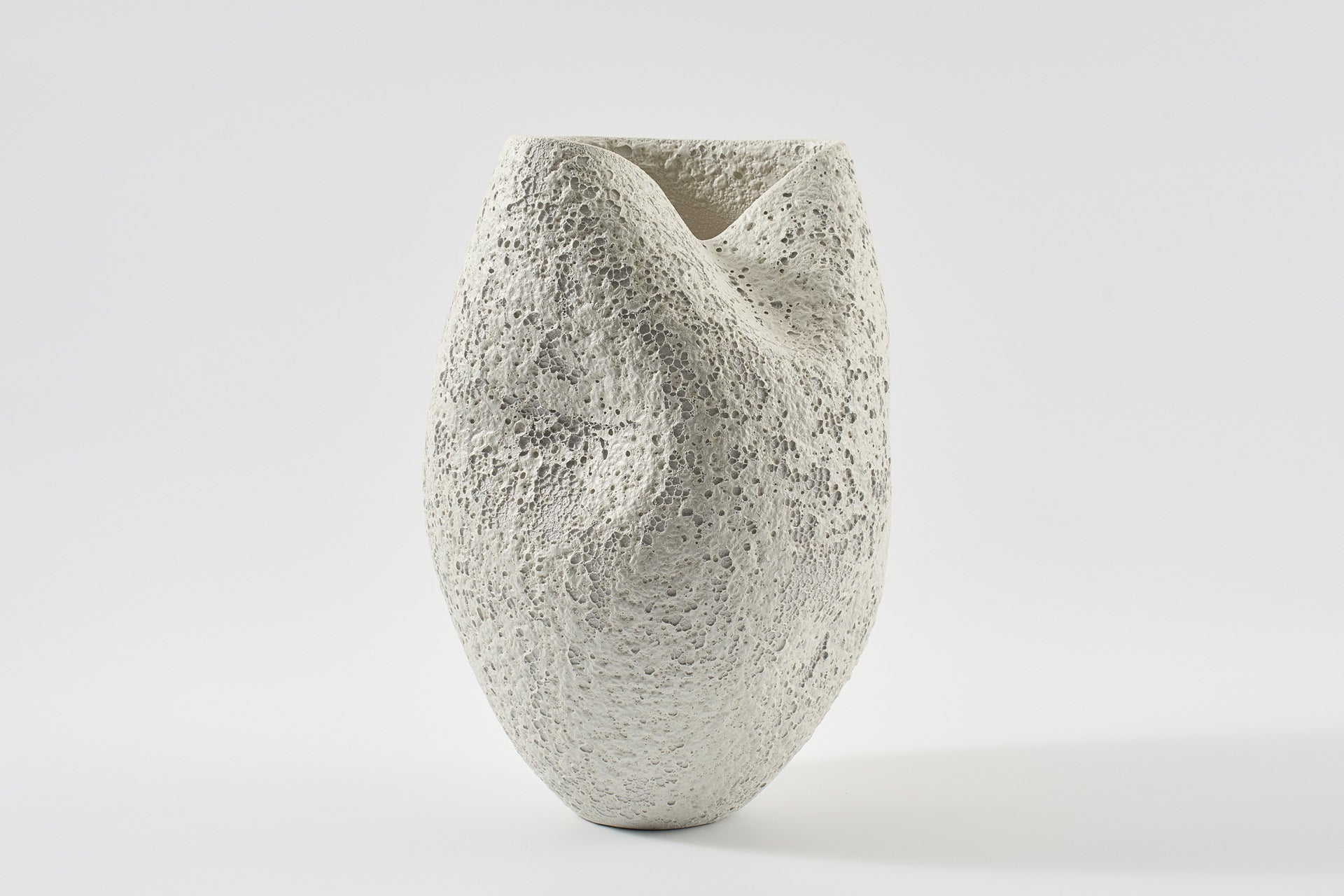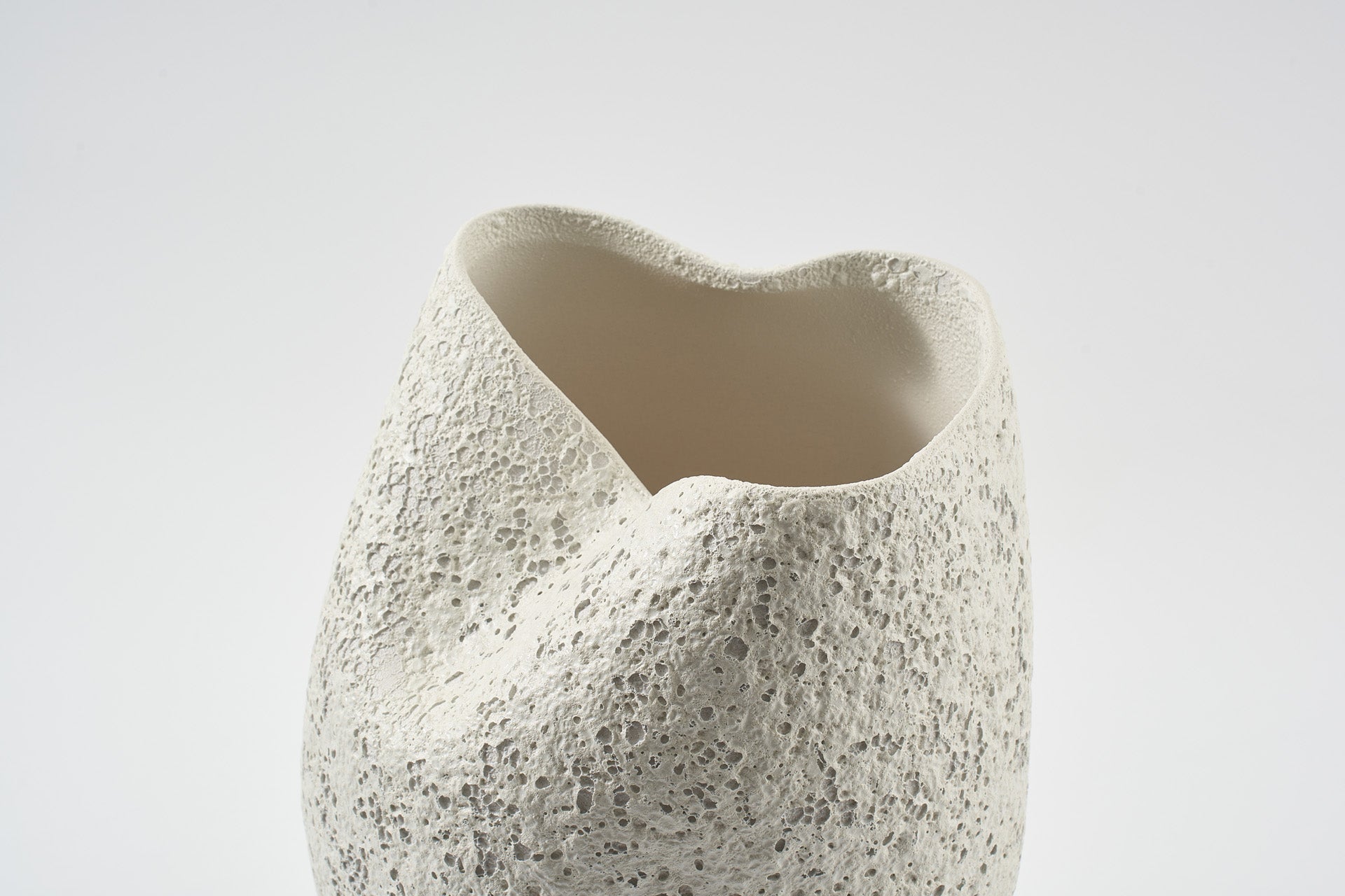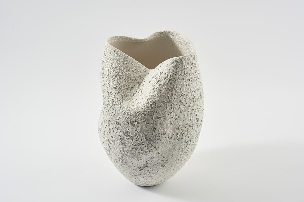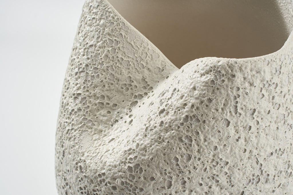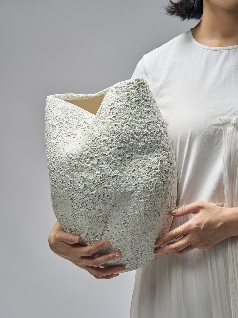 Salt crust finish –This handmade surface is alive with clustered bubbles, frozen mid-rise, creating a landscape of soft craters and luminous pockets of air.