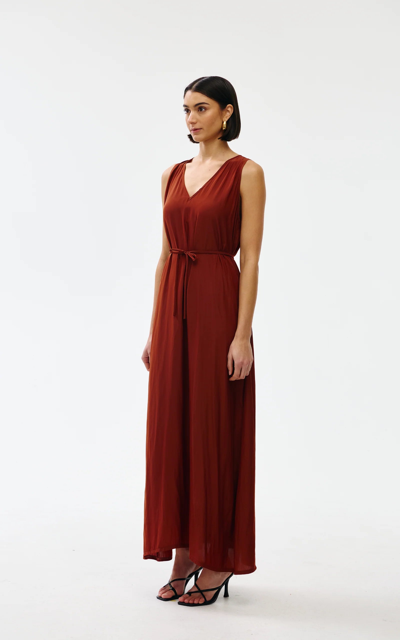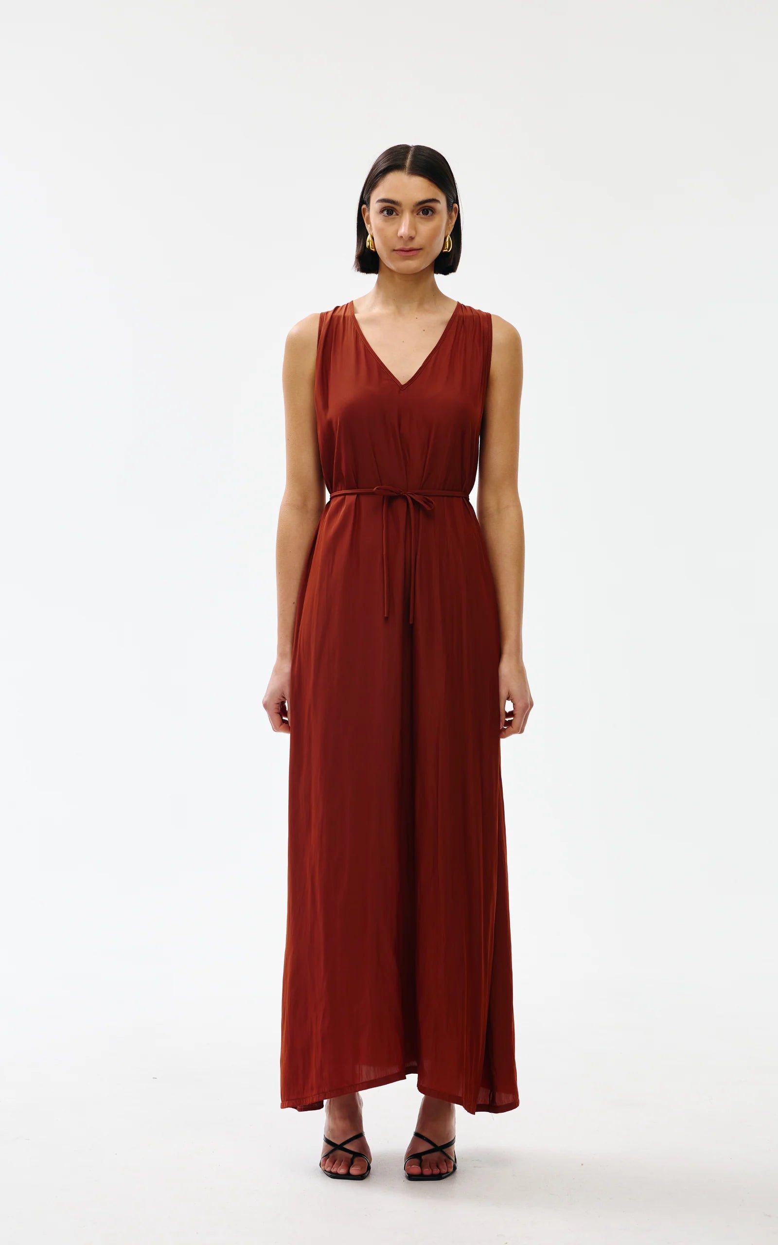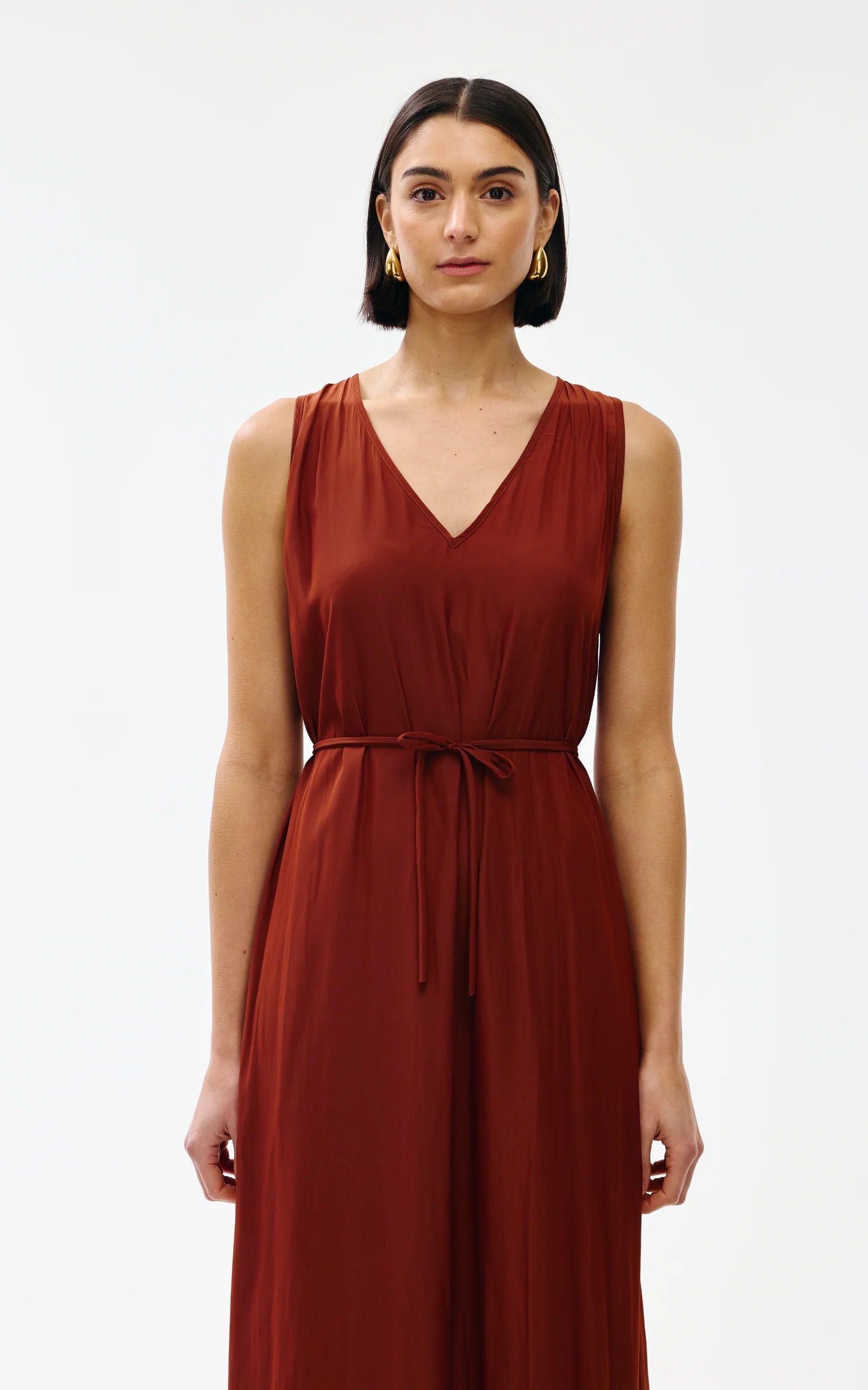 The sleeveless design features a soft V-neckline and a relaxed straight cut silhouette that skims the body without clinging. The fine detachable belt allows you to cinch the waist to create gentle shape.