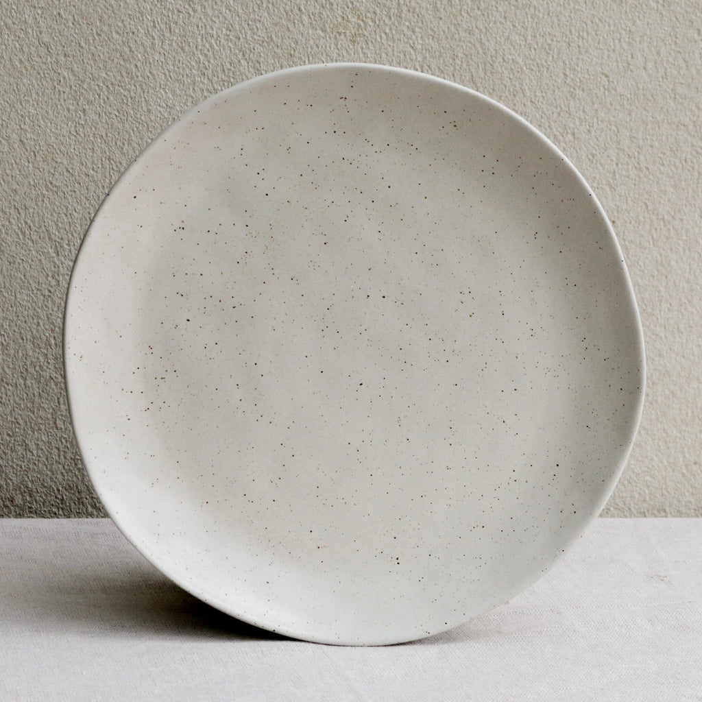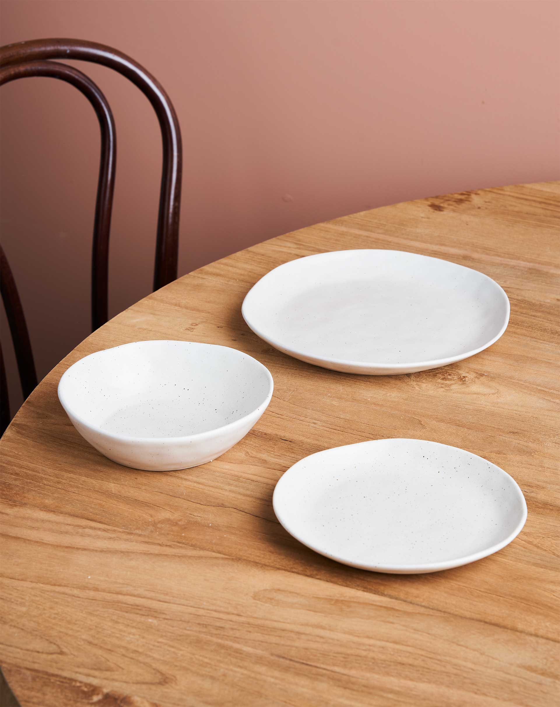 Hospitality grade, high-fired porcelain dinnerware collection in a reactive glaze, Earth is available in natural colourway.