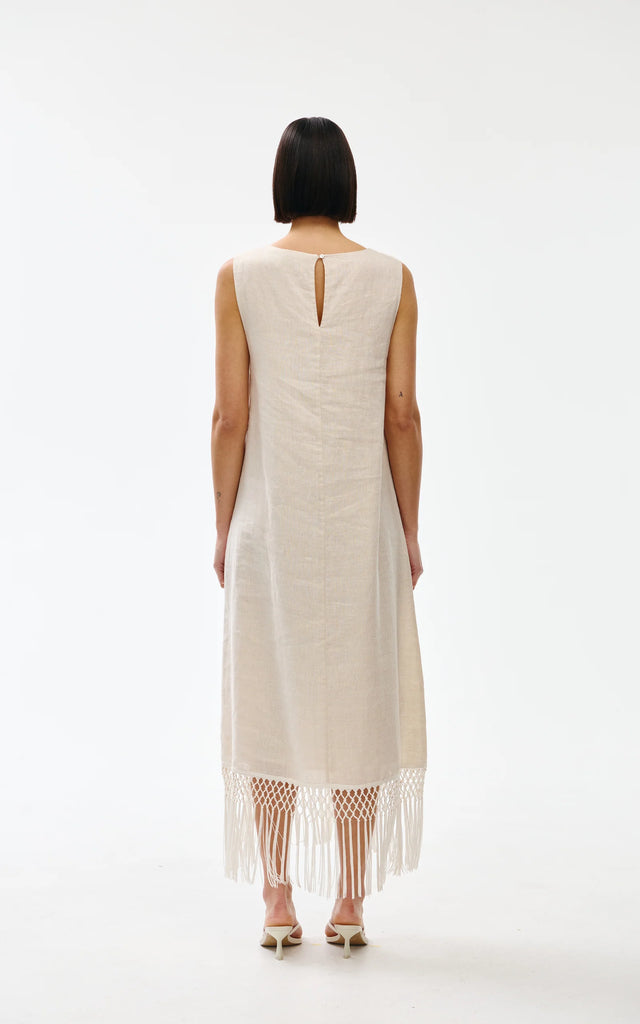 Crafted from a breathable, linen fabric, this sleeveless midi dress features a relaxed silhouette that drapes beautifully on the body. The minimalist design is elevated with a beautiful macramé look fringed hem, adding a touch of charm and movement to each step.