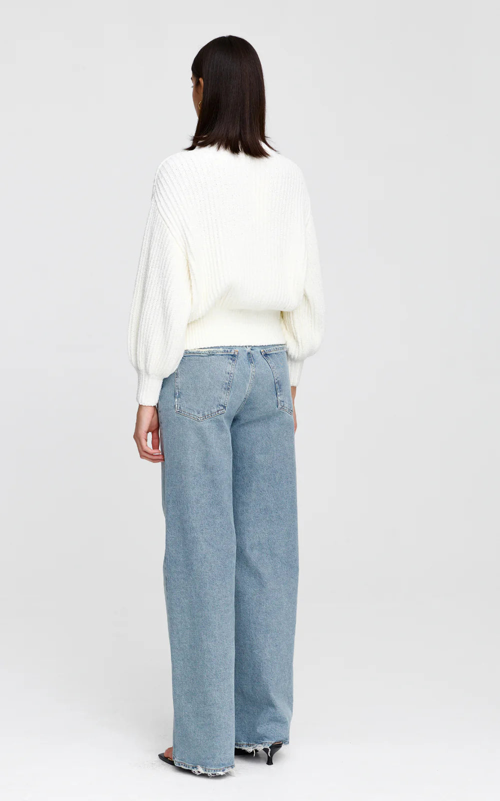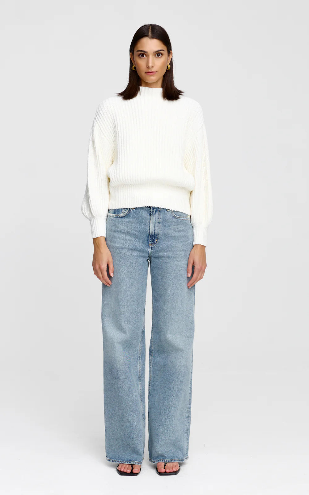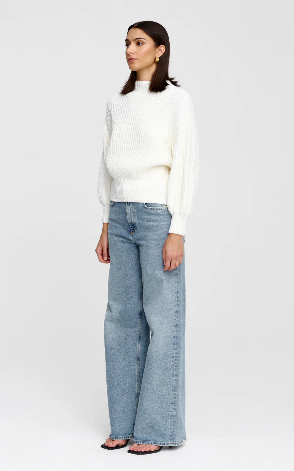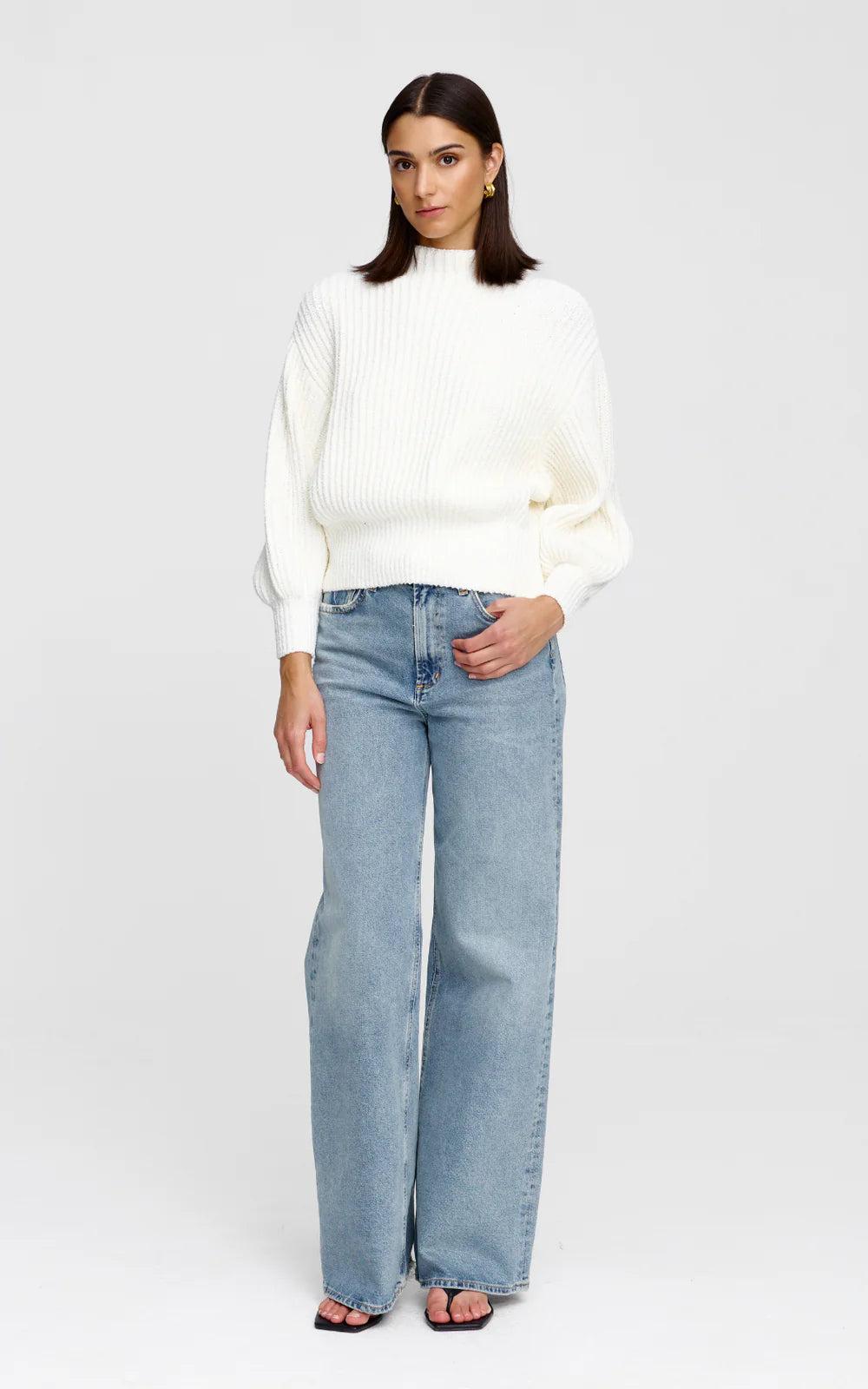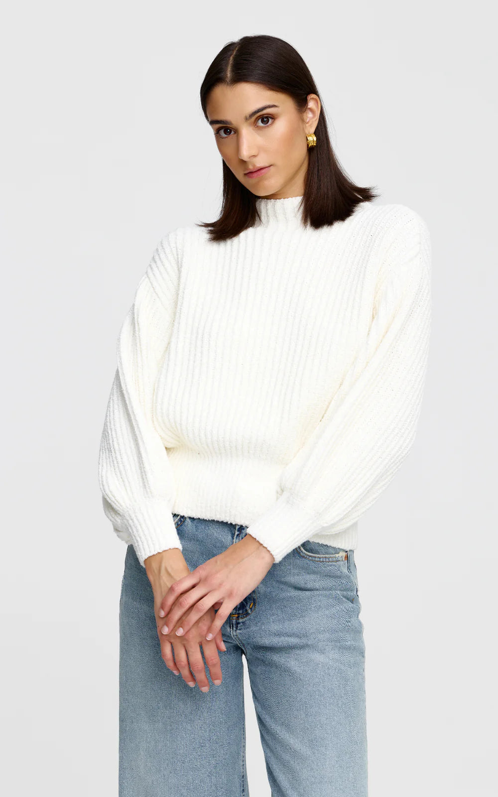 The Harper Knit is a textured style with a modern silhouette. Featuring a mock neck collar, bishop style sleeves and a structured hem that sinches in at the waist.