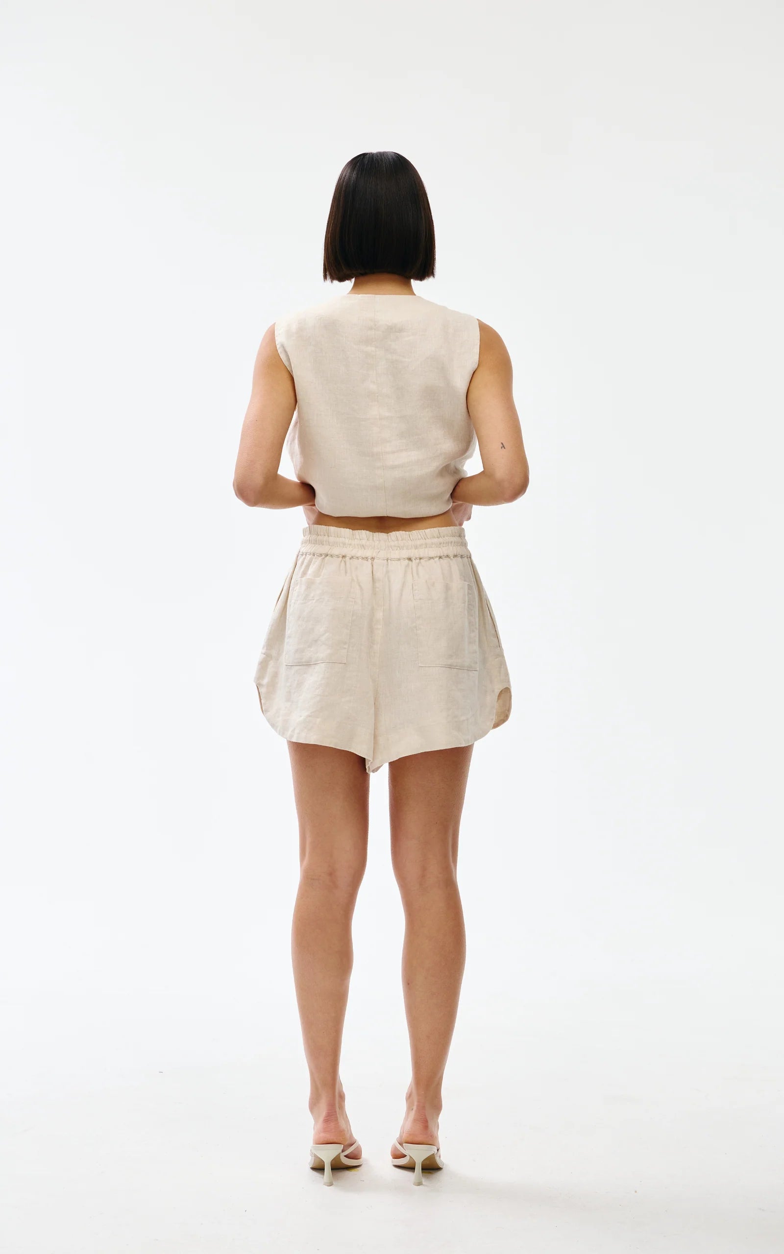 The JuniperShortStoneis made in our classic, flattering short shape.They featurein-seam pockets, an elasticated waistband and waist-tie with gold toggles.