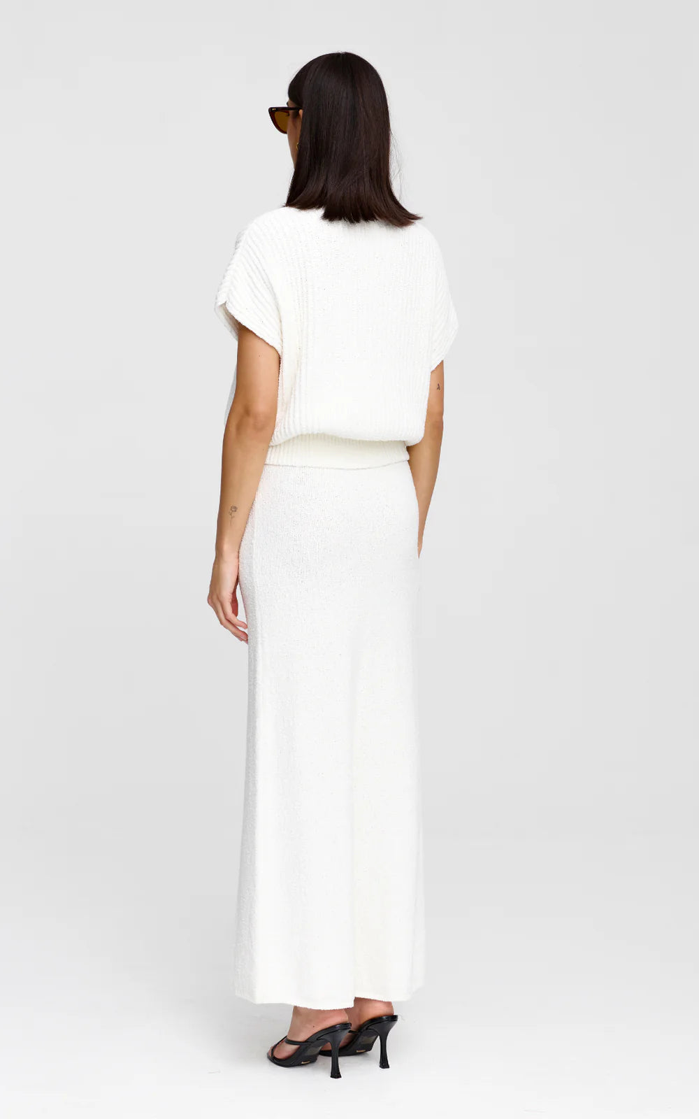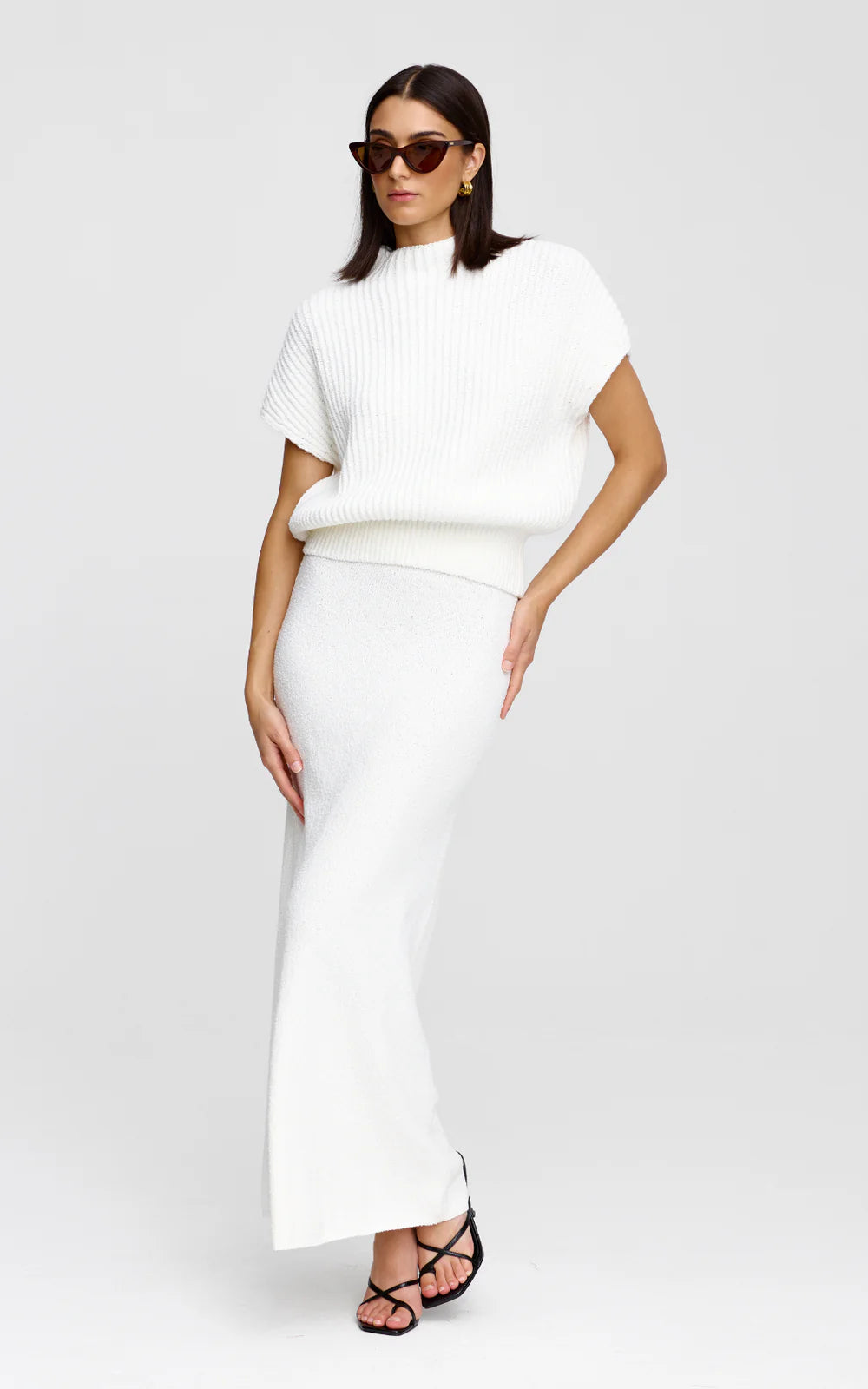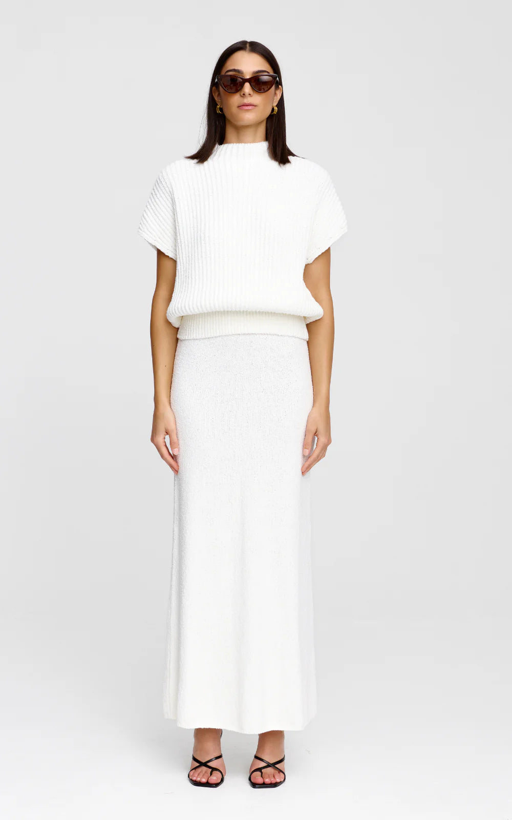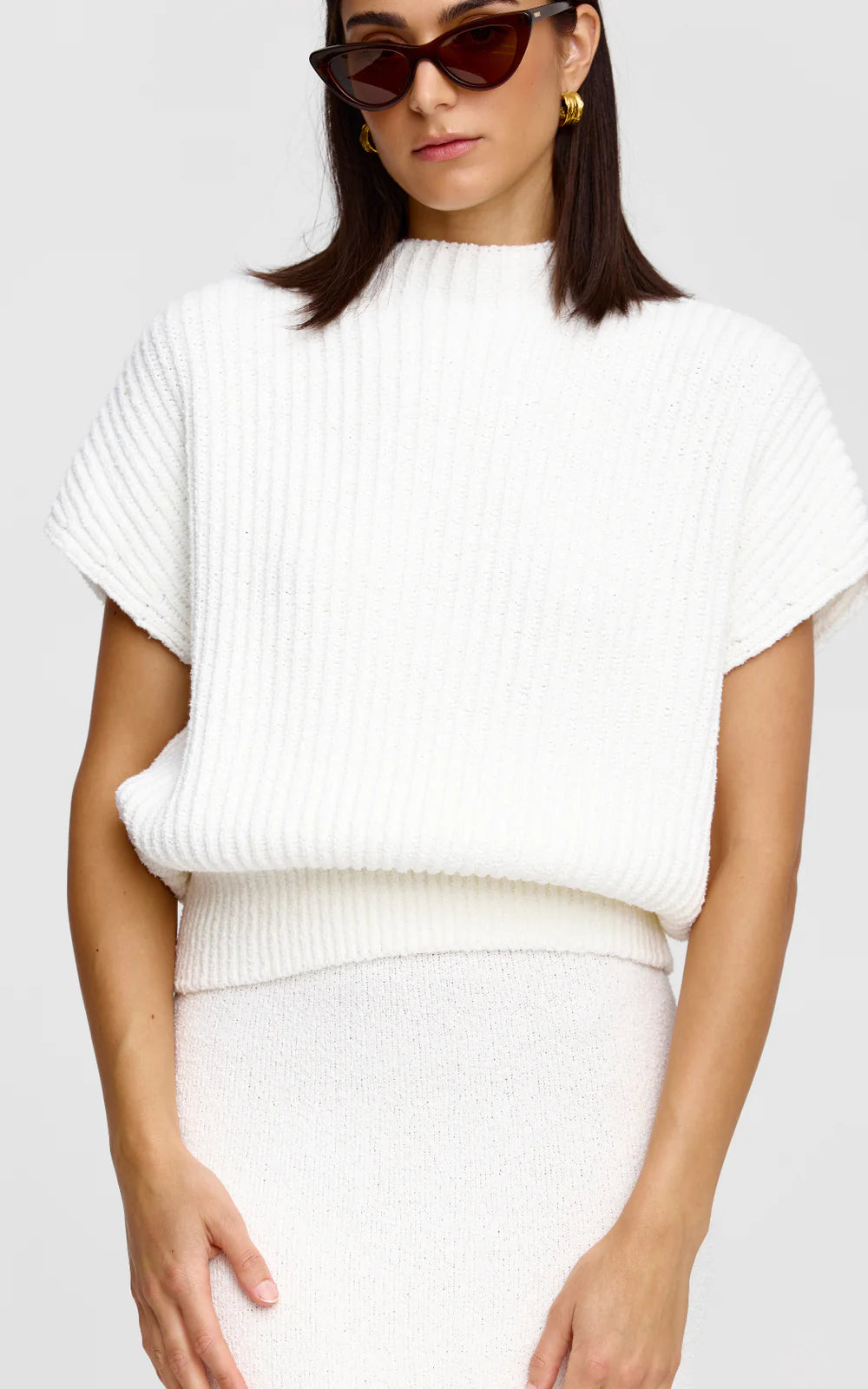 The Laurel Knit is a minimalist and textured style with a modern silhouette. Featuring a mock neck collar, wide cap sleeves and a structured hem that sinches in at the waist.