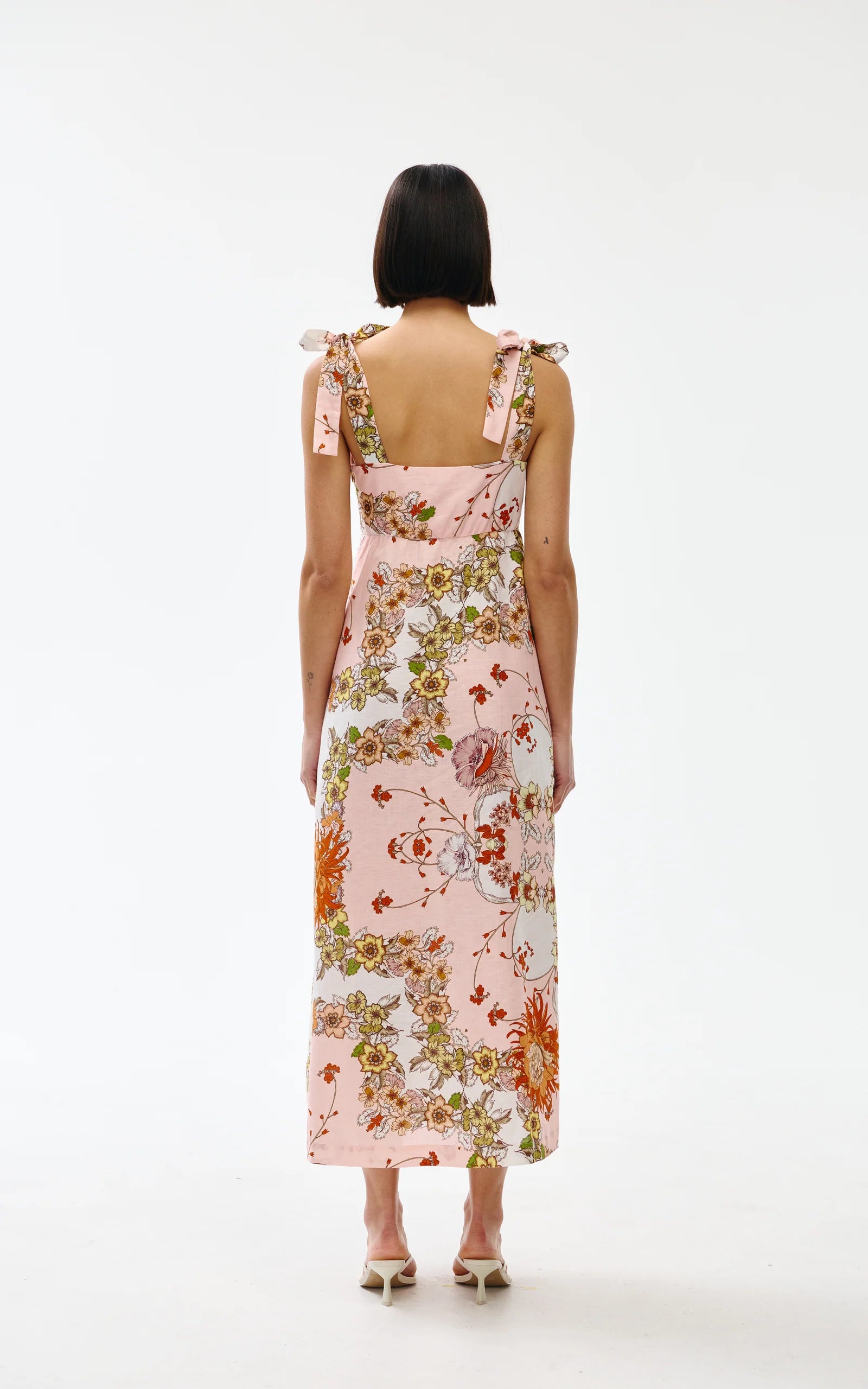 This midi dress features a straight neckline, in-seam pockets, invisible zip at the side, and wide shoulder straps that can be tied on your shoulders to achieve the most comfortable fit.