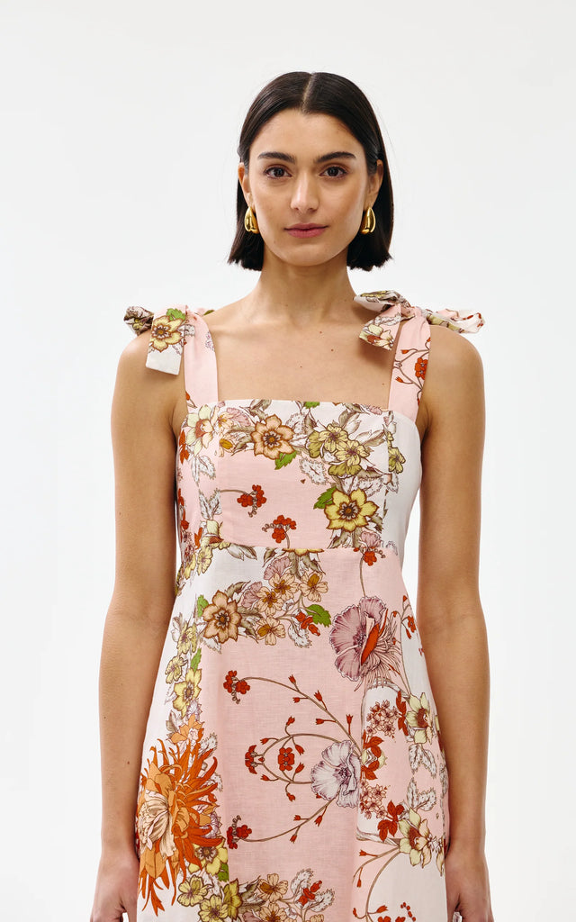 The Volterra print evokes a romantic, vintage-inspired charm with its intricate patchwork of blooming florals. Style it with slides or sandals for an easy daytime look.